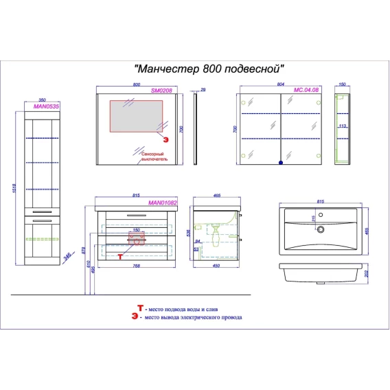 Механизм доводчика, Ящик, Ручки, Подсветка, Сенсорный выключатель, Зеркало, Тумба под раковину, Раковина
