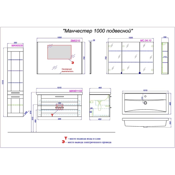 Механизм доводчика, Ящик, Полочка, Ручки, Зеркало-шкаф, Тумба под раковину, Раковина