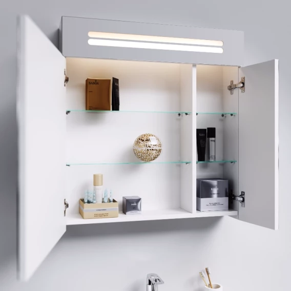 Механизм доводчика, Ящик, Полочка, Ручки, Подсветка, Зеркало-шкаф, Выключатель, Розетка, Ножки, Тумба под раковину, Раковина