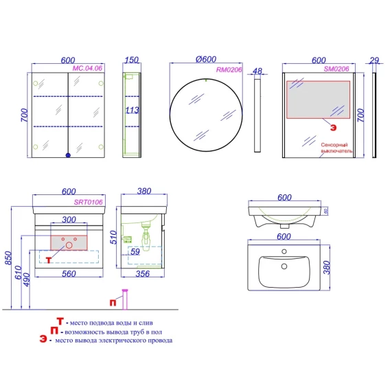 Механизм доводчика, Ящик, Зеркало, Тумба под раковину, Раковина