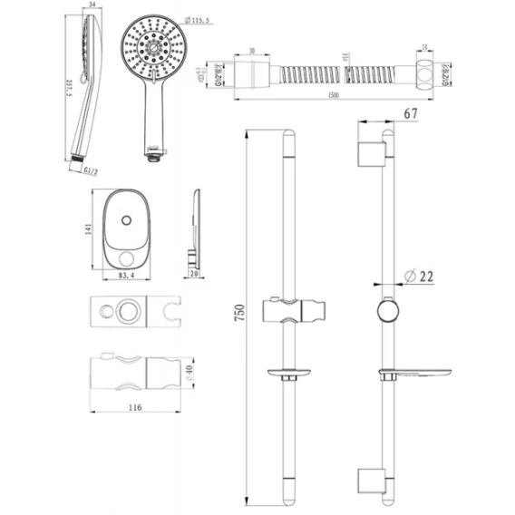 Душевой шланг, Душевая лейка, Держатель для душевой лейки, Мыльница, Штанга душевая
