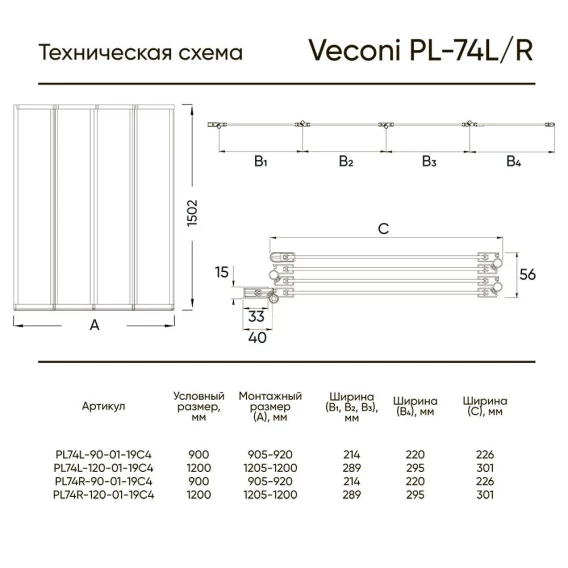 Шторка для ванны 90 см Veconi Palau PL74BL-90-01-19C4 прозрачное