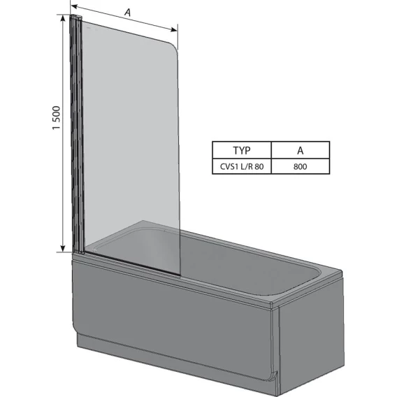 Шторка для ванны СVS1. Одноэлементная, подвижная. Шторка может поворачиваться к ванне, а так же в противоположную сторону к наружной стене. Размер: 80 см.; высота изделия 1500 мм., цвет профиля: Сатин, витраж из безопасного стекла: Транспарент