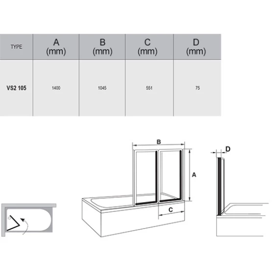 Штора состоит из двух подвижных частей, которые складываются вовнутрь ванны. Штора подходит для прямоугольных ванн RAVAK с ровным передним бортом (Classic, Sonata, Vanda II и Lilia) или для какой-либо классической прямоугольной ванны с ровным передним бортом. Стандартная высота шторы 1400 мм. Штора для ванны VS2 в сложенном виде имеет ширину 545 мм. Повернув VS2 на 180°, получите Л/П варианты входа.