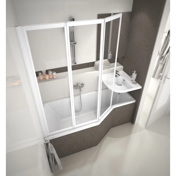 Штора состоит из трех подвижных частей, которые складываются вовнутрь ванны. Штора подходит для ванны BeHappy и других прямоугольных ванн с ровным передним бортом (Classic, Sonata, Vanda II и Lilia) или какой-либо классической прямоугольной ванны с ровным передним бортом. Стандартная высота шторы 1400 мм. Штора для ванны VS3 115 - BeHappy 160. Штора для ванны  VS3 115 — 392 мм. Повернув VS3 на 180°, получите Л/П варианты входа.