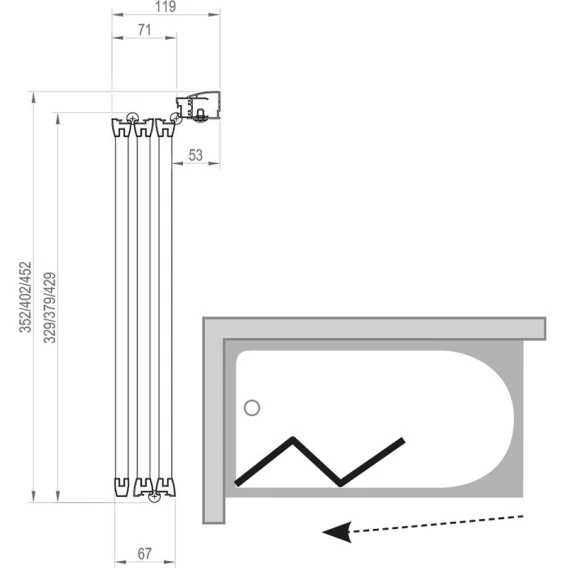 Штора состоит из трех подвижных частей, которые складываются вовнутрь ванны. Штора подходит для ванны BeHappy и других прямоугольных ванн с ровным передним бортом (Classic, Sonata, Vanda II и Lilia) или какой-либо классической прямоугольной ванны с ровным передним бортом. Стандартная высота шторы 1400 мм. Штора для ванны VS3 130 - BeHappy 170. Штора для ванны VS3 130 в сложенном виде имеет ширину - 444 мм. Повернув VS3 на 180°, получите Л/П варианты входа.