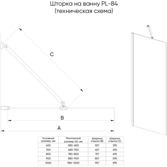 Шторка на ванну Veconi Palau PL84B-60-01-C8 60 см, профиль черный матовый, стекло прозрачное