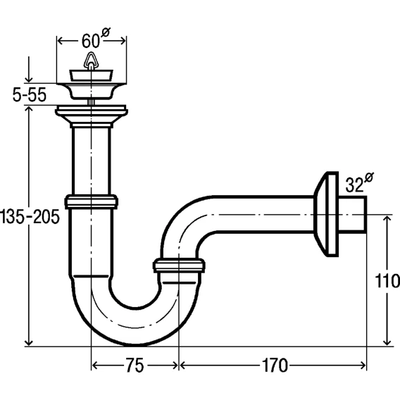 верхняя розетка из нержавеющей стали, пробка, уплотнительный элемент, выдвижной патрубок 100 мм, отводящее колено 170 ммконтроль качества согласно DIN 274