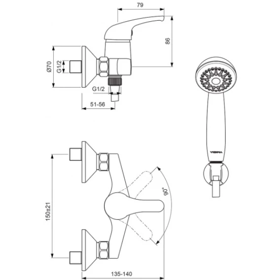 Крепление, Душевой шланг, Душевая лейка, Держатель для душевой лейки
