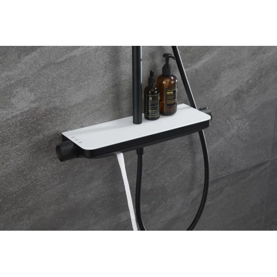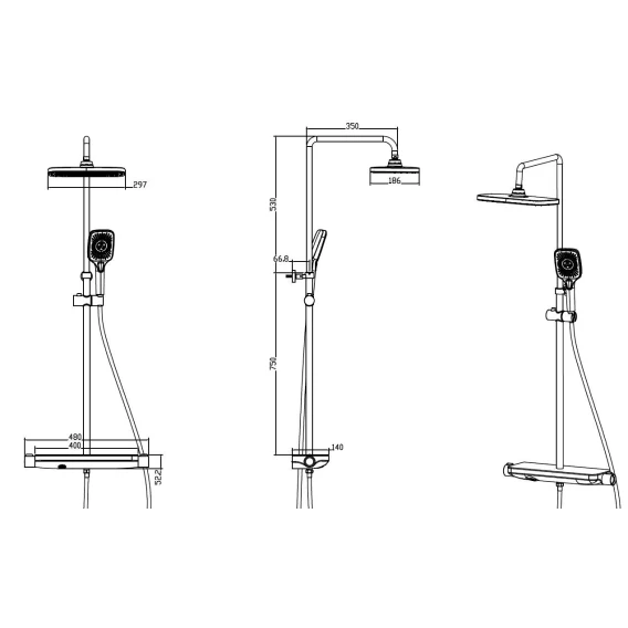 Металлическая розетка, Эксцентрики, Душевой шланг, Душевая лейка, Держатель для душевой лейки, Полочка, Верхний душ, Смеситель, Кронштейн, Штанга душевая