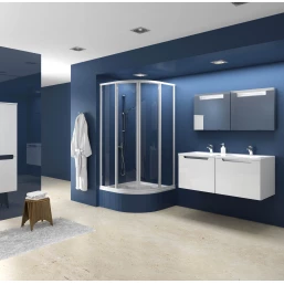 Устанавливается в облицованный кафелем угол ванной комнаты на глубокий поддон Sabina. Общая высота душевого уголка с поддоном 2120 мм. Радиус 500 мм.