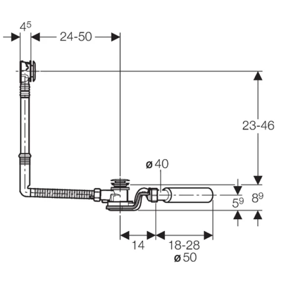 Применение• Для ванн со сливным отверстием ø 52 мм• Для установки в ванных нестандартной длиныОписание• Подключение к сливной трубе полиэтиленовым фановымотводом ø 40/50 мм, может быть вставным или приварным• Сливной клапан из нержавеющей стали• Слив для ванны с системой нажатия кнопки, находящейсяпочти на одном уровне с ванной• Габаритная высота сифона 90 мм• Сифон с шарнирным соединением 270°