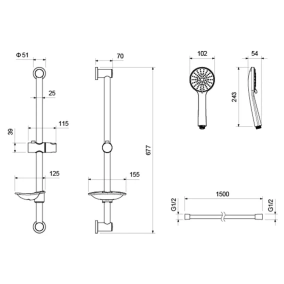 Крепление, Металлическая розетка, Эксцентрики, Душевой шланг, Душевая лейка, Держатель для душевой лейки, Мыльница, Штанга душевая