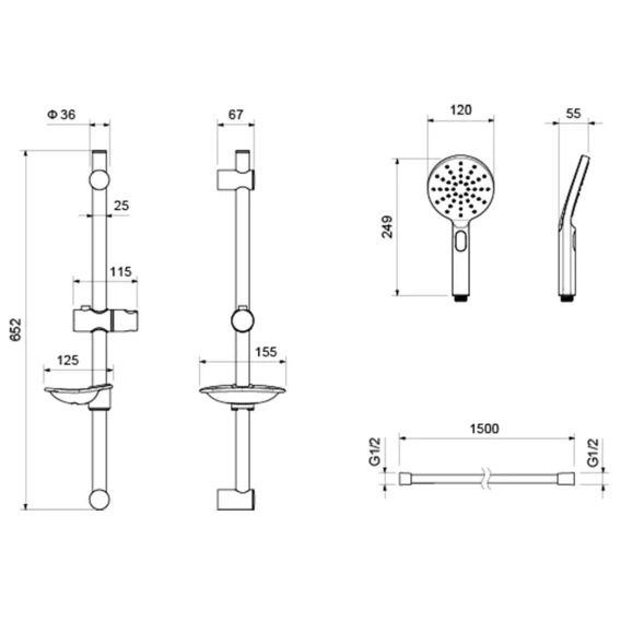 Крепление, Металлическая розетка, Эксцентрики, Душевой шланг, Душевая лейка, Держатель для душевой лейки, Мыльница, Штанга душевая