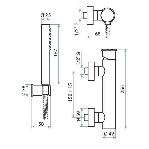 Металлическая розетка, Эксцентрики, Душевой шланг, Душевая лейка, Держатель для душевой лейки