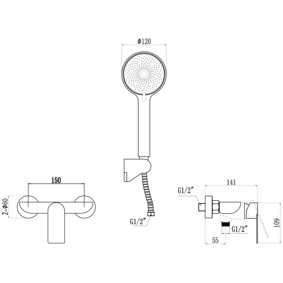 Металлическая розетка, Эксцентрики, Душевой шланг, Душевая лейка, Держатель для душевой лейки