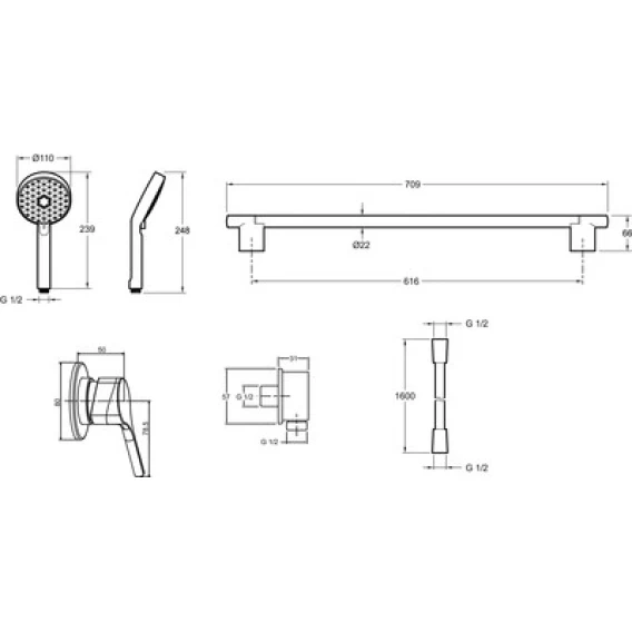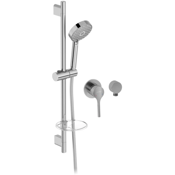 Крепление, Душевой шланг, Душевая лейка, Держатель для душевой лейки, Подключение для душевого шланга, Скрытая монтажная часть, Смеситель, Мыльница, Штанга душевая