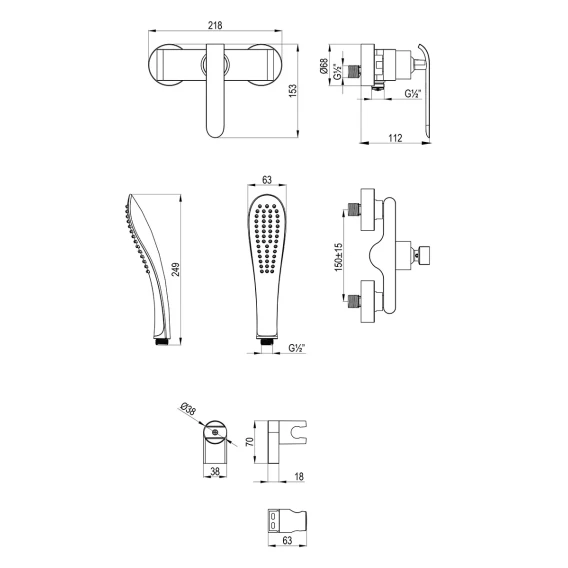 Металлическая розетка, Эксцентрики, Душевой шланг, Душевая лейка, Держатель для душевой лейки