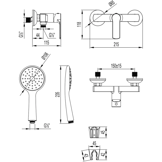 Металлическая розетка, Эксцентрики, Душевой шланг, Душевая лейка, Держатель для душевой лейки