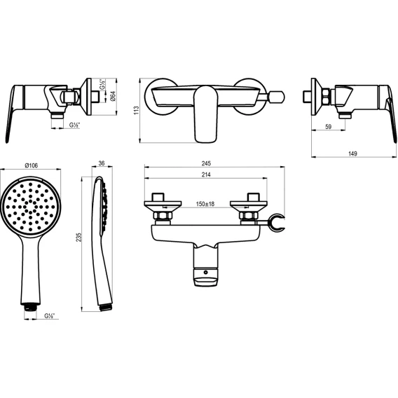 Металлическая розетка, Эксцентрики, Душевой шланг, Душевая лейка, Держатель для душевой лейки