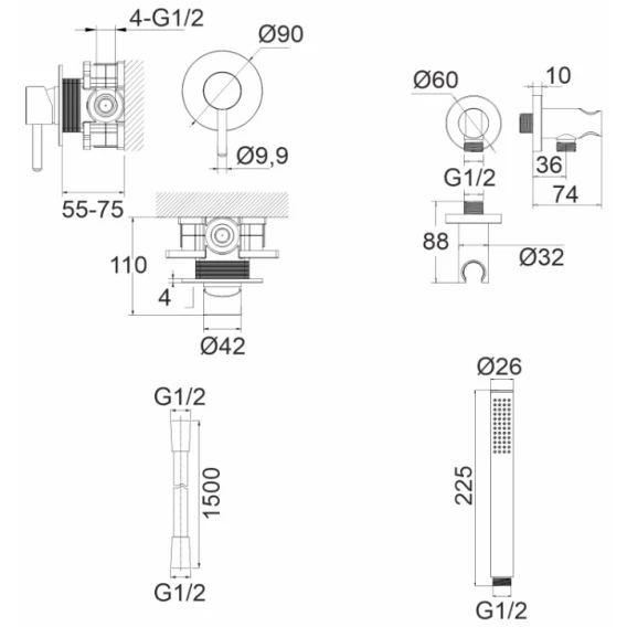 Душевой шланг, Душевая лейка, Подключение для душевого шланга с держателем, Скрытая монтажная часть