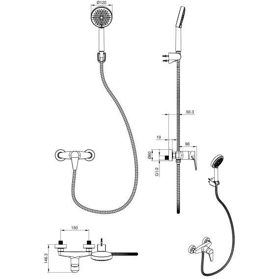 Металлическая розетка, Эксцентрики, Душевой шланг, Душевая лейка, Держатель для душевой лейки