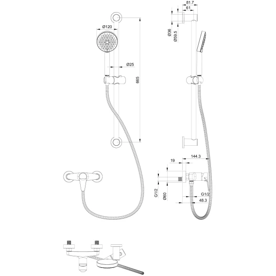 Металлическая розетка, Эксцентрики, Душевой шланг, Душевая лейка, Держатель для душевой лейки, Штанга душевая