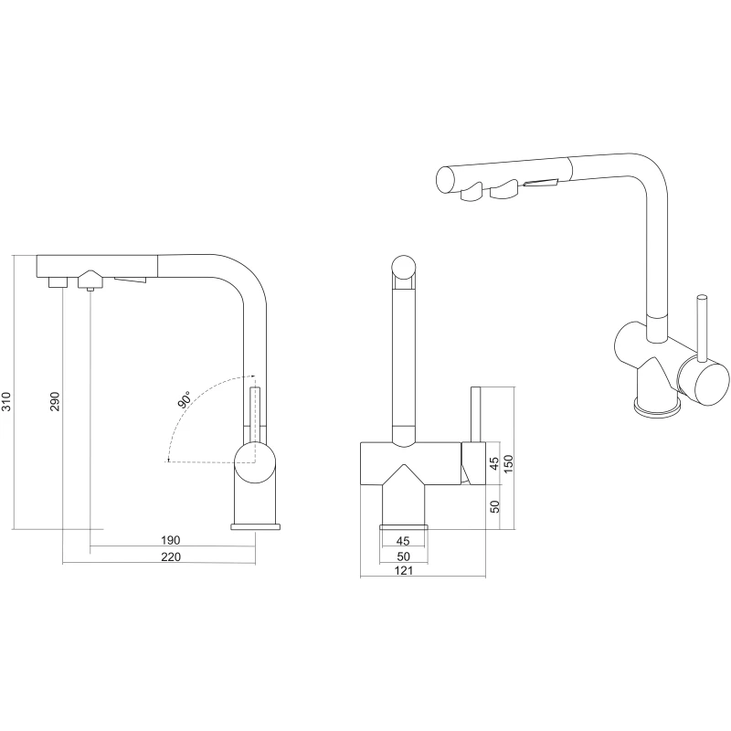 Крепление, Аэратор, Гибкая подводка, Душевой шланг, Душевая лейка