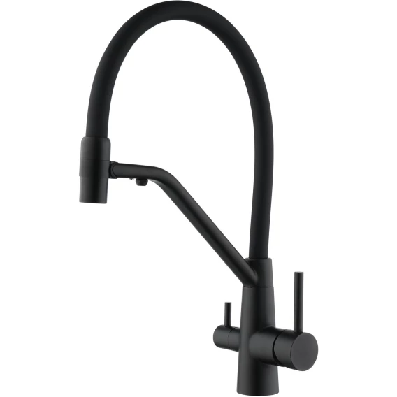 Мягкий и прочный, в цвет корпуса — матовый чёрный. Излив легко принимает нужное положение, фиксируется в специальном поворотном пазе корпуса. Вращение паза вместе с изливом позволяет направлять воду под нужным углом — будь то фильтр или водопровод.