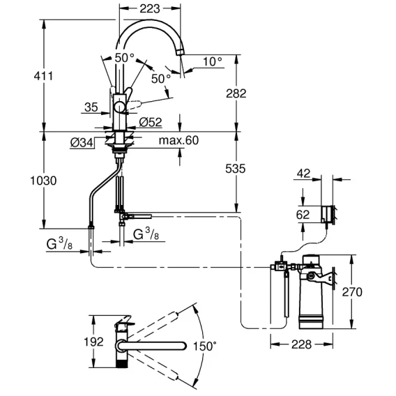 • угол поворота 150°