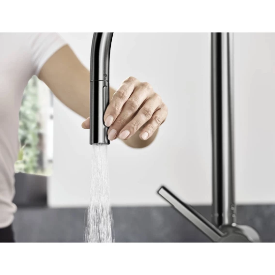 • Запираемая душевая струя, смена струи нажатием кнопки и автоматический сброс струи при закрытии смесителя
