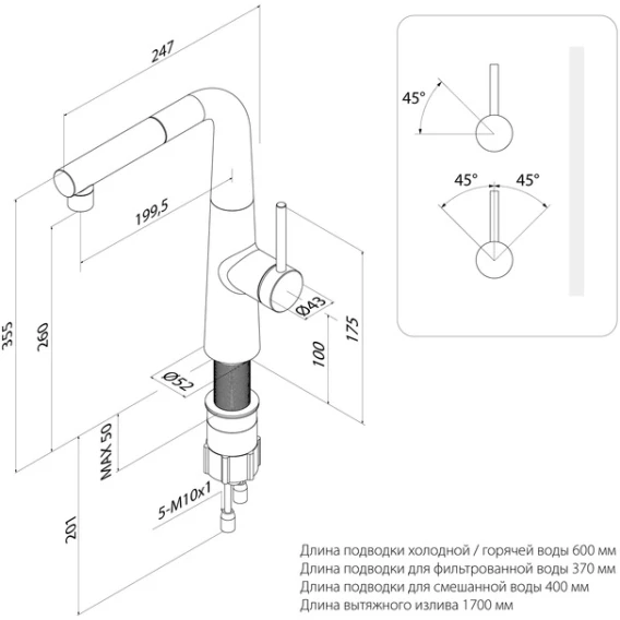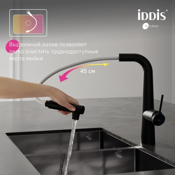 • Излив выдвигается на 45 см и позволяет дотянуться до всех углов мойки. Фильтрованная вода также подается из вытяжного излива.