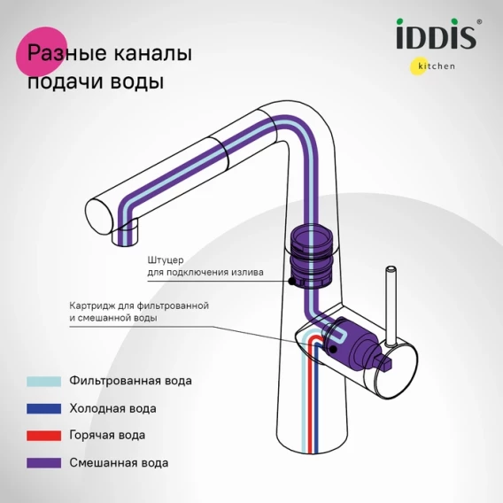 •  Встроенный отдельный канал для фильтрованной воды позволяет наслаждаться питьевой водой прямо из смесителя; нет необходимости в отдельном смесителе.