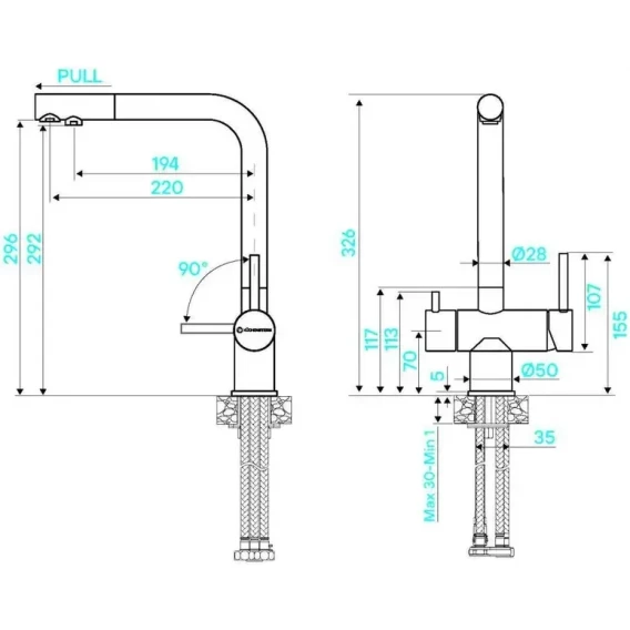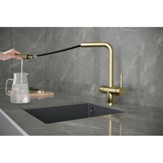 Смеситель для кухни KuchenStern Fokus FS 401GL40 CoolStart, с подключением к фильтру, выдвижным изливом, золотой матовый