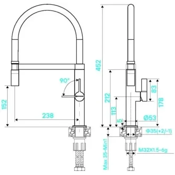 Смеситель для кухни KuchenStern Turm E 405SS40 CoolStart, с гибким изливом, нержавеющая сталь