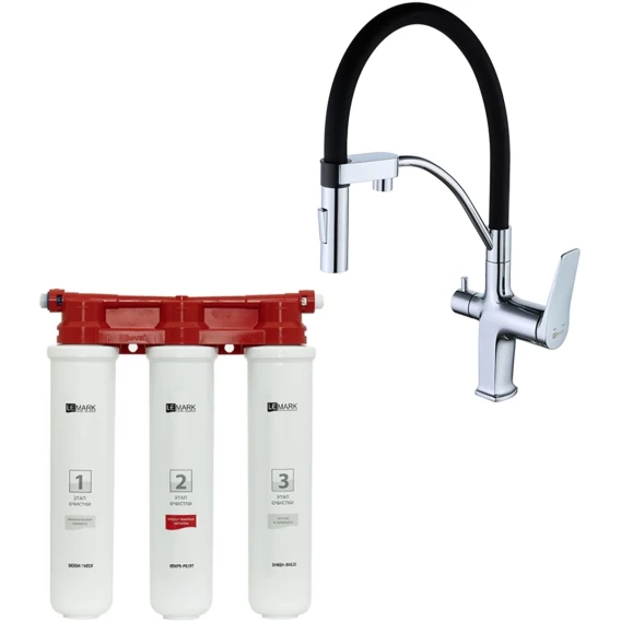 Состав комплекта:1.Смеситель с гибким изливом для кухни Comfort LM3074C с подключением к фильтру питьевой воды2. Фильтр BASIC для очистки воды от хлора и тяжелых металловОсновные особенности смесителя:•Цвет: хром/черный•Материал: латунь•Тип управления: одноручковый•Подключение фильтра для чистой воды•2-функциональная излив-лейка с аэратором Neoperl® Perlator® для водопроводной воды • Аэратор для питьевой воды Neoperl® Perlator®•Керамический картридж Sedal® Cold Start Termaclick Mirror 35 мм®Основные особенности водоочистителя:•Тип очищаемой воды: Питьевая водопроводная •Ресурс: 8 000л •Скорость фильтрации: 2л/мин•Технология фильтрации: Механическая, сорбционная (проточная) система •Способ замены картриджей: одной рукой за 30 секунд