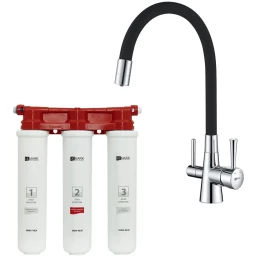 Состав комплекта:1.Смеситель с гибким изливом для кухни Comfort LM3075C с подключением к фильтру питьевой воды2.Фильтр BASIC для очистки воды от хлора и тяжелых металловОсновные особенности смесителя:•Цвет: хром/черный•Материал: латунь•Тип управления: одноручковый•Подключение фильтра для чистой воды•Комбинированный аэратор для водопроводной и питьевой воды•Керамический картридж Sedal® Cold Start Termaclick Mirror 35 мм®Основные особенности водоочистителя:•Тип очищаемой воды: Питьевая водопроводная •Ресурс: 8 000л •Скорость фильтрации: 2л/мин•Технология фильтрации: Механическая, сорбционная (проточная) система •Способ замены картриджей: одной рукой за 30 секунд