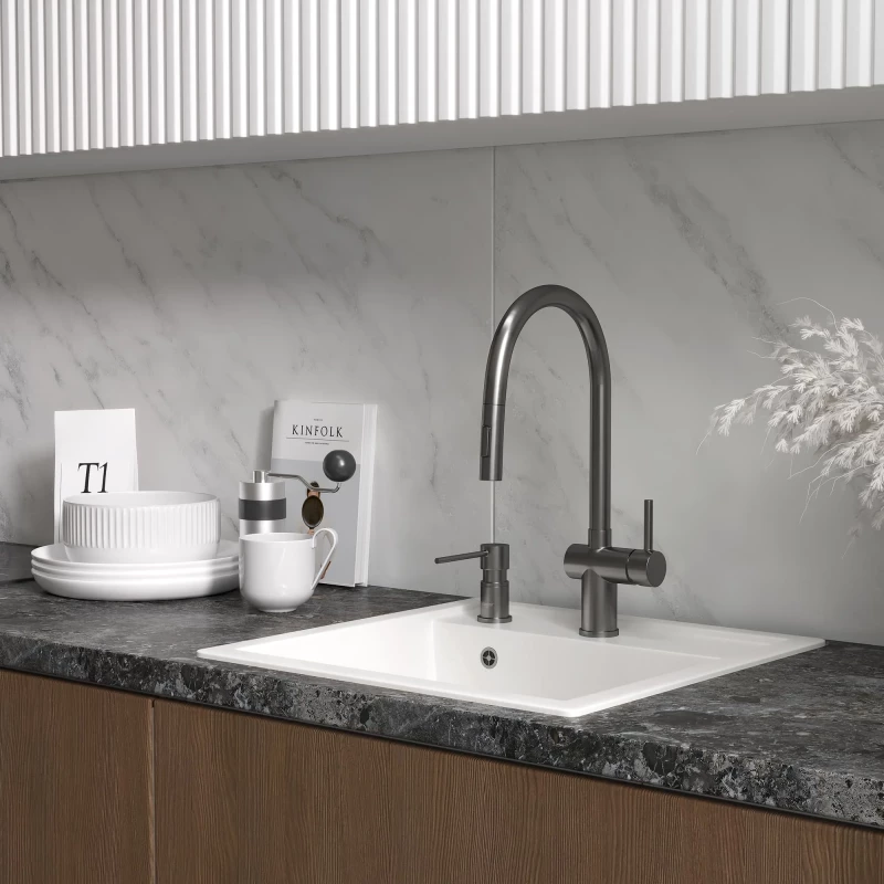 Смеситель для кухни Reflexion Lago RX9904BL с выдвижным изливом, оружейная сталь