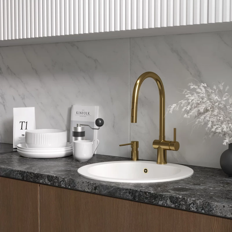 Смеситель для кухни Reflexion Lago RX9904GD с выдвижным изливом, золотой матовый