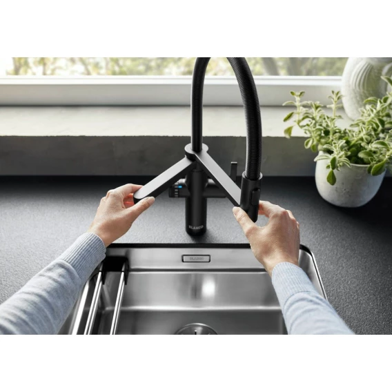 Смеситель BLANCO EVOL-S Pro Filter подключается к фильтру для очистки водопроводной воды. Результат: питьевая вода с прекрасным вкусом. Обычная водопроводная вода и фильтрованная вода подаются через два отдельных излива на кухонном смесителе.