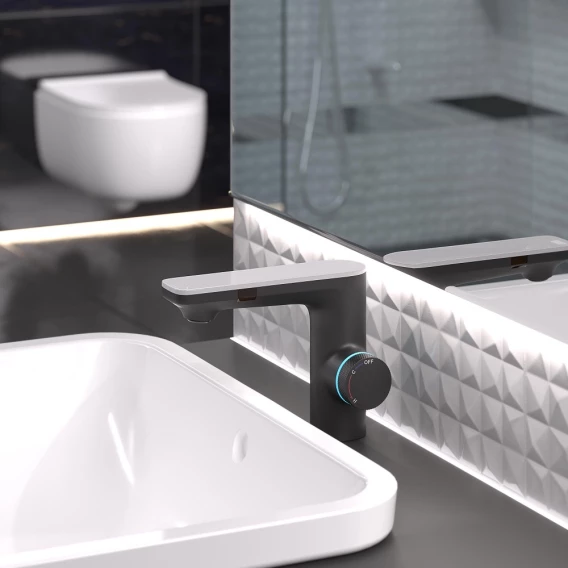 • Два режима включения: боковой сенсор отвечает, за непрекращающийся поток воды (реакция 0,1 сек.), фронтальный сенсор - за экономичный, прерывающийся, поток воды (реакция 0,5 сек.).
