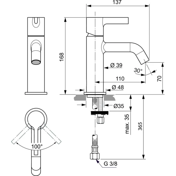 JOY Однорукоятковый смеситель для умывальника, 5 л/мин, керамический картридж 28 мм, с функцией HWTC (ограничение максимальной температуры горячей воды), без функции CLICK, логотип Ideal Standard на корпусе, металлическая рукоятка без индикаторов горячей / холодной воды, аэратор Caché M16,5x1 с ограничением потока 5 л/мин, система монтажа EASY-FIX (облегченный монтаж), гибкая подводка G3/8" PEX
