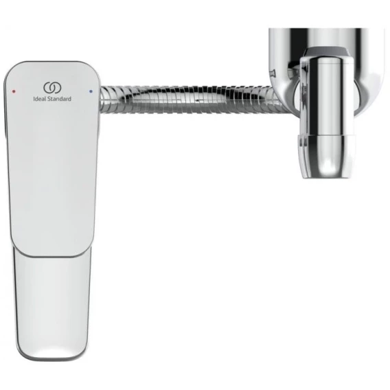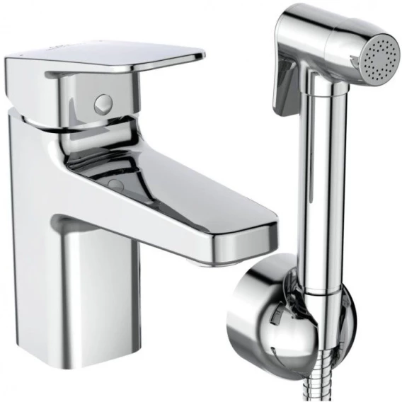 CERAPLAN Смеситель для раковины с гигиеническим душем, без донного клапана, система монтажа EASY-FIX (облегченный монтаж), гибкая подводка G3/8", картридж FirmaFlow 38 мм с функцией HWTC (ограничение максимальной температуры горячей воды), металлическая рукоятка с индикаторами горячей / холодной воды, аэратор Slim с ограничением потока 5 л/мин, с металлически шлангом и настенным держателем для лейки