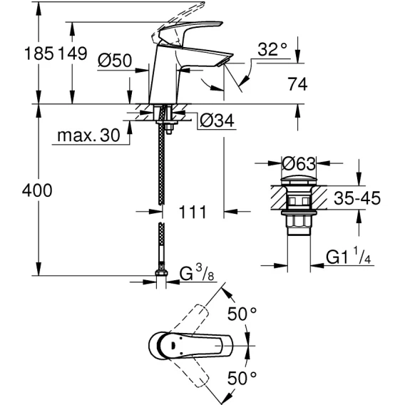 Смеситель для раковины Grohe Eurosmart 239682433 с донным клапаном, черный матовый
