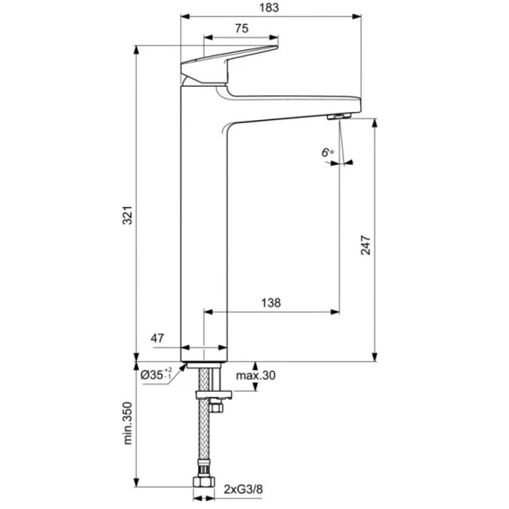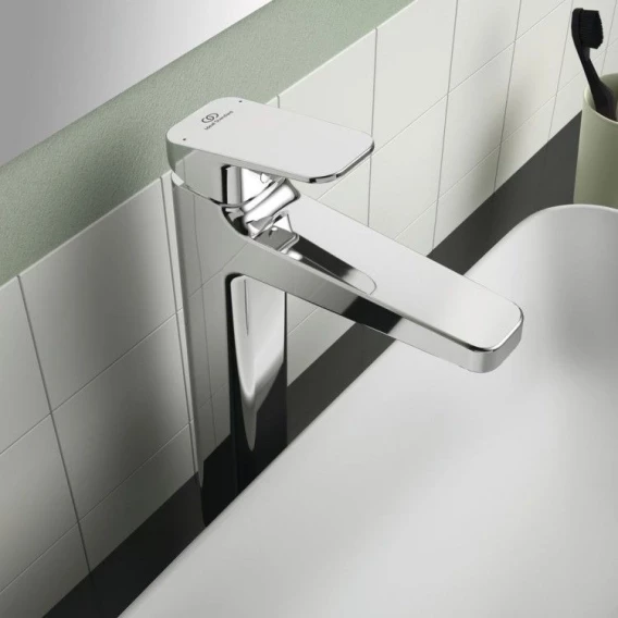 CERAPLAN Vessel Смеситель для раковины без донного клапана, система монтажа EASY-FIX (облегченный монтаж), гибкая подводка G3/8", картридж FirmaFlow 38 мм с функцией HWTC (ограничение максимальной температуры горячей воды), металлическая рукоятка с индикаторами горячей / холодной воды, аэратор Slim с ограничением потока 5 л/мин