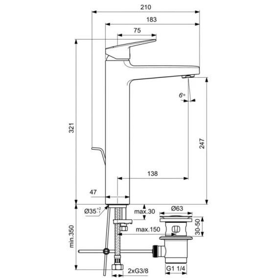 CERAPLAN Vessel Смеситель для раковины с металлическим донным клапаном, система монтажа EASY-FIX (облегченный монтаж), гибкая подводка G3/8", картридж FirmaFlow 38 мм с функцией HWTC (ограничение максимальной температуры горячей воды), металлическая рукоятка с индикаторами горячей / холодной воды, аэратор Slim с ограничением потока 5 л/мин