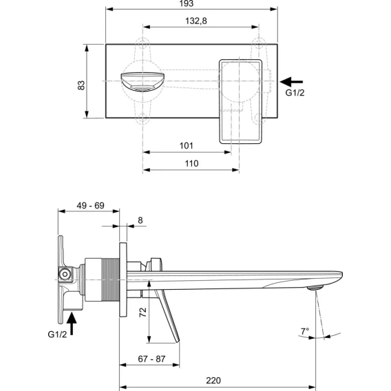 керамический картридж 28 мм, с функцией HWTC (ограничение максимальной температуры горячей воды), без функции CLICK,литой излив 220 мм,металлическая накладка с логотипом Ideal Standard,металлическая рукоятка без индикаторов горячей/холодной воды,аэратор Coin slot M24x1 с ограничением потока 5 л/мин.,для монтажа с комплектом №1 A1313NU (встраиваемая часть приобретается отдельно).Цветное покрытие - технология PVD