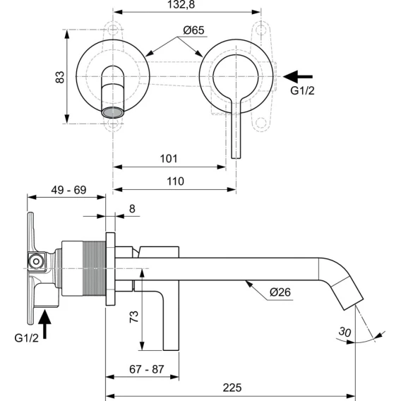 A7379AA JOY Встраиваемый смеситель для умывальника, комплект №2 (внешняя часть),керамический картридж 28 мм, с функцией HWTC (ограничение максимальной температуры горячей воды), без функции CLICK,трубчатый излив 225 мм,металлическая рукоятка без индикаторов горячей/холодной воды, аэратор Caché M16,5x1 с ограничением потока 5 л/мин,для монтажа с комплектом №1 A1313NU (встраиваемая часть приобретается отдельно)