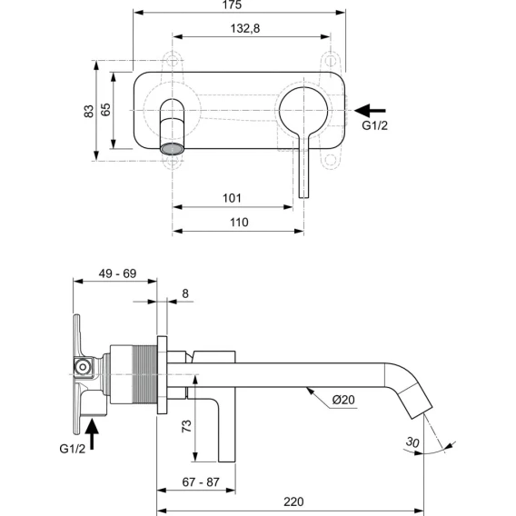 JOY Встраиваемый смеситель для умывальника, комплект №2 (внешняя часть)керамический картридж 28 мм,с функцией HWTC (ограничение максимальной температуры горячей воды),без функции CLICK, трубчатый излив 225 мм,прямоугольная со скругленными углами металлическая накладка с логотипом Ideal Standard,металлическая рукоятка без индикаторов горячей / холодной воды,аэратор Caché M16,5x1 с ограничением потока 5 л/мин,для монтажа с комплектом №1 A1313NU (встраиваемая часть приобретается отдельно)