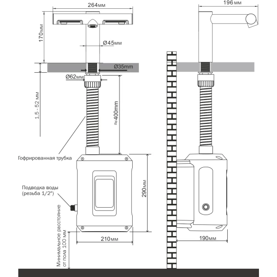• Терморегулятор устанавливается с блоком управления смесителя под раковиной